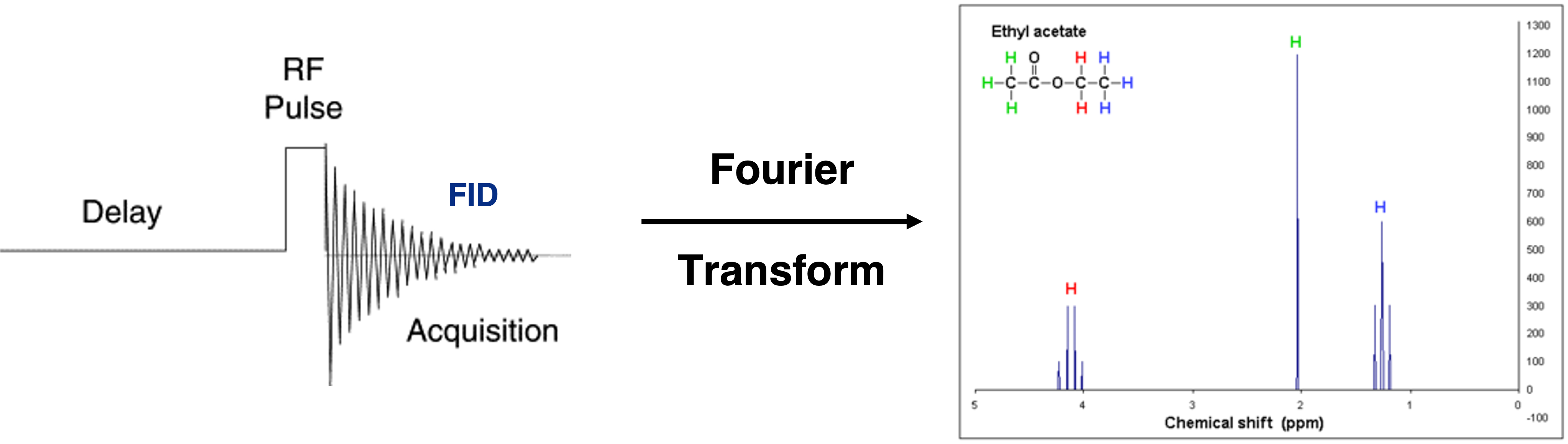 이 과정에서 나오는 신호를 free induction decay (FID)라고 하며, 이 신호를 습득하여 fourier transform을 통해 변환하면 우리가 볼 수 있는 NMR spectrum이 나타나게 됩니다.