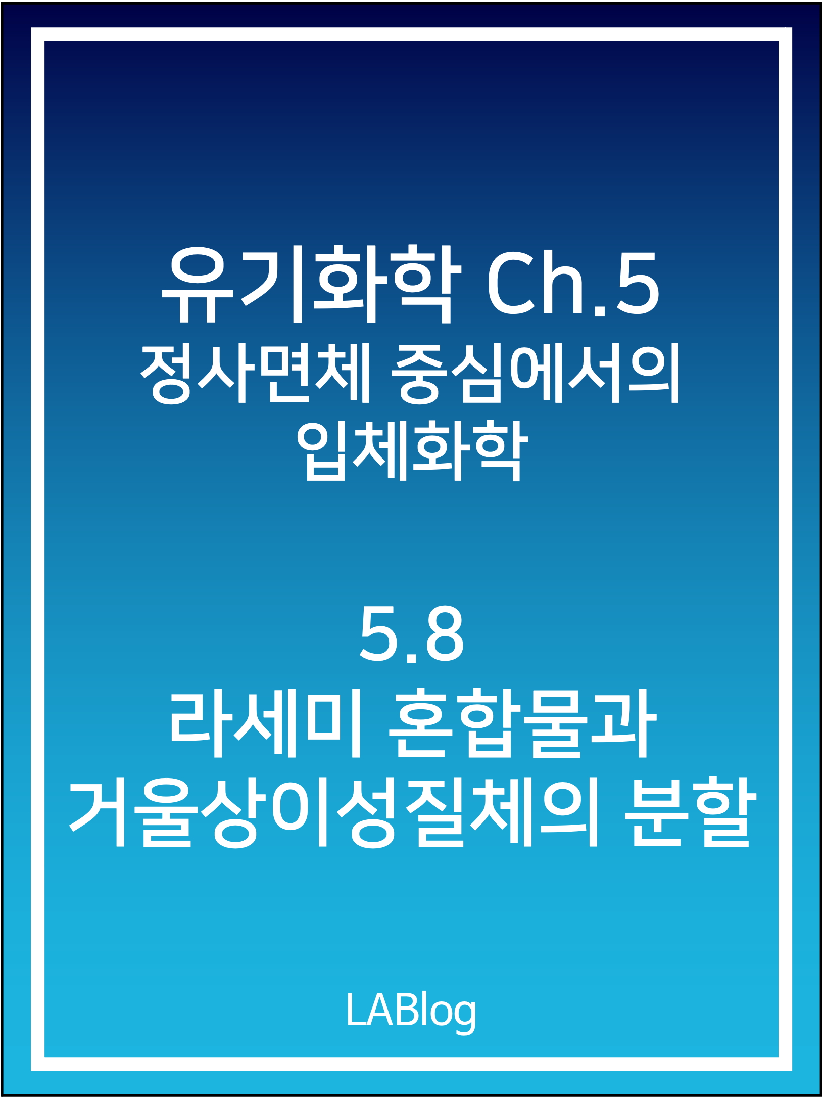 라세미체 또는 라세미 혼합물(racemate, racemic mixture): 카이랄성 분자의 (+), (-) 이성질체가 50:50으로 동일하게 섞여있는 혼합물 기호로는 (±)- 또는 dl-로 표시한다. 라세미 혼합물은 한 거울상이성질체로부터 생기는 (+) 방향 회전을 다른 거울상이성질체의 (-) 방향 회전이 정확히 상쇄하기 때문에 광학 회전을 나타내지 않는다. 분할(resolve): 라세미 혼합물에서 (+), (-) 거울상이성질체를 각각 분리하는 것. 일반적인 분할 방법: 카이랄 카복실산의 라세미 혼합물과 아민 염기 사이의 산-염기 반응으로 암모늄 염을 만드는 것. 예를 들어 lactic acid에 메틸아민과 같은 비카이랄 염기를 처리하면 R, S 모두 반응성이 같기 때문에 racemic ammoniu..