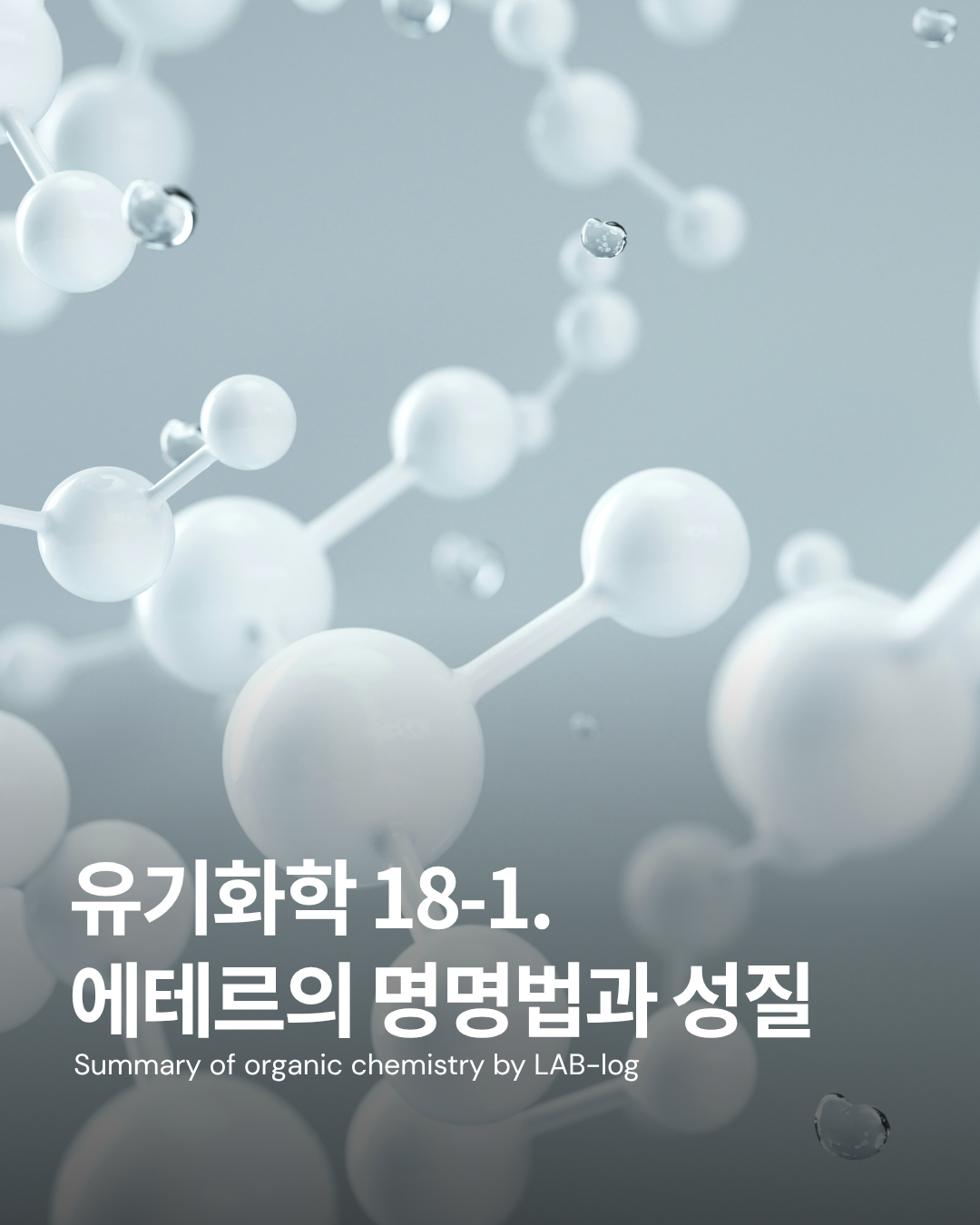 1. 에테르의 명명법단순 에테르 (Simple ethers)산소에 결합된 두 개의 유기 치환기 이름을 확인한 후 뒤에 'ether'를 붙여 명명함.예: Isopropyl methyl ether, Ethyl phenyl ether.복잡한 에테르의 명명분자 내에 다른 작용기가 존재하는 경우, 에테르 부분을 알콕시(alkoxy) 치환기로 간주함.예: p-Dimethoxybenzene, 4-tert-Butoxy-1-cyclohexene. 2. 에테르의 구조와 물리적 성질분자 기하 구조에테르의 R-O-R 결합은 물과 거의 유사한 구조를 가짐.산소 원자는 sp3 혼성 상태이며, 결합각은 약 112도(dimethyl ether 기준)로 사면체 구조에 가까움.끓는점 (Boiling points)산소 원자의 전기 음성도..
